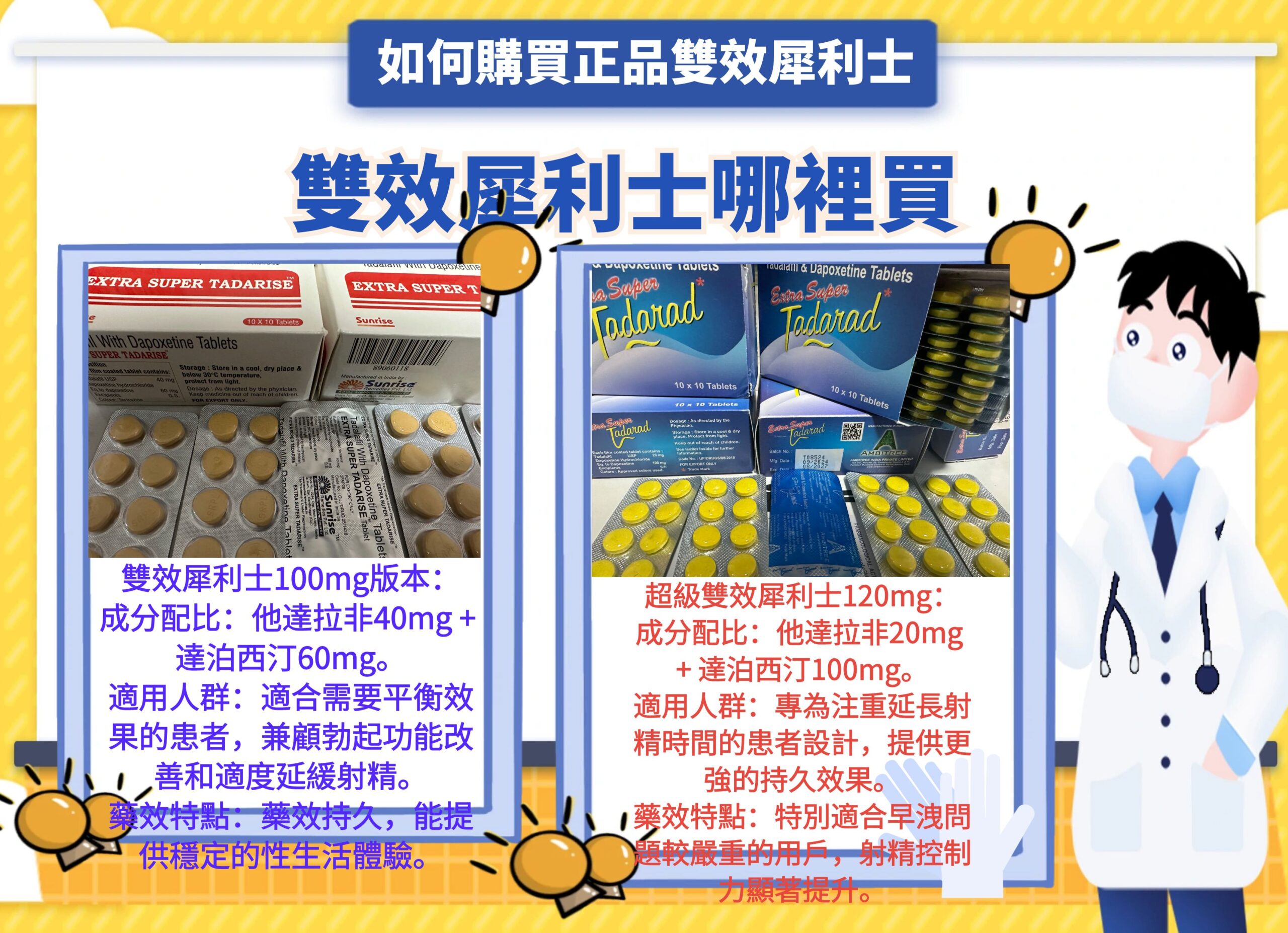 雙效犀利士(Super Tadarise)是一款結合了他達拉非(Tadalafil)助勃與達泊西汀(Dapoxetine)早洩的藥物,專為同時治療勃起功能障礙(ED)和早洩(PE)設計。由於其強大的雙重效果,許多男性對此藥物需求高漲。然而,如何確保購買到正品雙效犀利士,成為一個重要的問題。